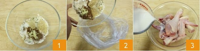 Para realizar el pollo frito americano, comienza preparando la mezcla de especias: coloca en un bol todas las especias y la harina 1 luego transfiérelas a una bolsa de congelación para mezclarlas 2. Coloca los muslos y las alas de pollo en un bol y vierte dentro el suero de leche 3, para hacerlo en casa sigue nuestra ficha Cómo hacer suero de leche.