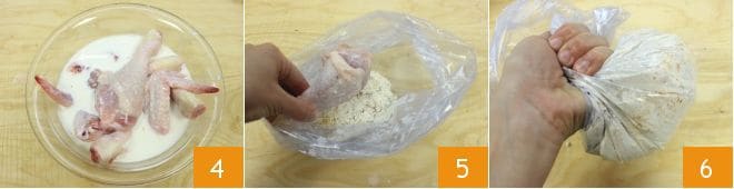 Gira las piezas de pollo para que se humedezcan bien 4 luego insértalas en la bolsa de congelación junto con las especias 5, cierra bien la bolsa con una mano y agítala para sazonar las piezas de pollo, que deben quedar bien enharinadas 6. Deja reposar el pollo unos minutos.