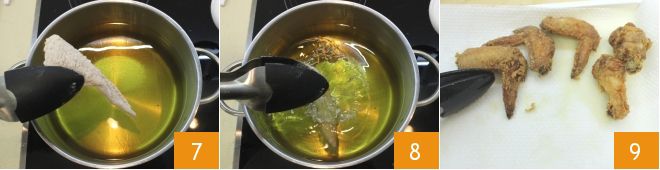 Mientras tanto, pon al fuego una cazuela con aceite de semillas, calienta el aceite, la temperatura ideal es de unos 170°-180°, si no dispones de un termómetro, sumerge un pellizco de pan rallado en el aceite y si chisporrotea entonces está listo para freír. Las piezas de pollo deben quedar bien sumergidas en el aceite 7, cocina el pollo 10 minutos por cada lado. Al final de la cocción, saca el pollo con unas pinzas de cocina 8 y colócalo sobre una bandeja cubierta con papel absorbente para que pierda el exceso de aceite 9. ¡Tu pollo frito americano está listo para disfrutar!