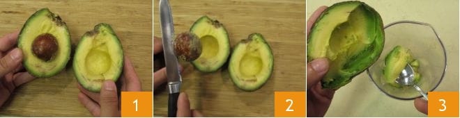 Para hacer los polos de aguacate y chocolate, primero limpia el aguacate: córtalo por la mitad 1, quita el hueso central 2, saca la pulpa con una cucharilla y colócala en un vaso alto 3.