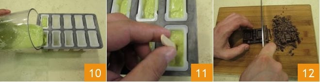 Vierte la mezcla dentro de los moldes para polos 10; nosotros hemos usado un molde de 10 polos con una capacidad de 70 ml cada uno. Inserta el palito 11 y ponlo en el congelador durante al menos 4 horas. Mientras tanto, pica el chocolate negro 12 y derrítelo al baño maría o en el microondas.
