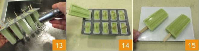 Cuando los polos estén listos, desmóldalos poniendo el molde bajo el agua corriente 13, así facilitarás la extracción (14-15).