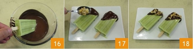 Ahora ocupa de la decoración: sumerge la punta de los polos en el chocolate 16 para crear un glaseado diagonal, cubre la parte de chocolate con el granillo de avellanas 17 y disfruta enseguida de tus polos de aguacate y chocolate 18!