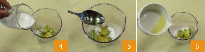 Añade también la leche de coco 4, la miel 5, el zumo de limón 6