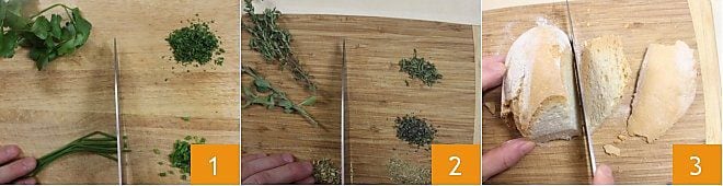 Para preparar las albóndigas aromáticas al vapor, comienza por picar las hierbas aromáticas: pica con cuchillo el cebollino 1 el perejil, el tomillo, la mejorana y las semillas de hinojo 2 y reserva. Toma el pan duro, elimina la corteza 3 y corta la miga en cubitos,
