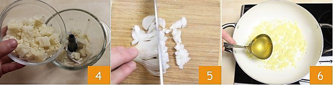 ponla en un procesador 4 y pícalo finamente. Lava la cebolleta, corta el tallo y resérvalo (servirá para sazonar el agua de cocción) pica el bulbo de la cebolleta 5, sofríe la cebolleta con un cucharón de caldo 6 o con agua hasta que se ablande.