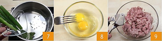 Toma una olla equipada con cesta para la cocción al vapor bastante grande y vierte el agua, añade los aromas: el laurel, los granos de pimienta y el tallo de la cebolleta que has conservado 7. Bate los huevos en un bol 8, sala y pimienta. En otro bol, pon la carne picada y sazónala con el ajo machacado 9,