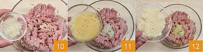 la cebolleta sofrita templada 10, los huevos previamente batidos 11 y por último la miga desmenuzada con el procesador 12.