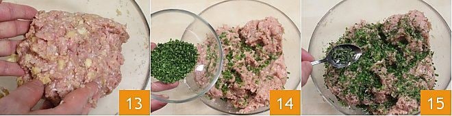 Amasa todo hasta que la mezcla sea homogénea y compacta 13. Añade ahora todas las hierbas aromáticas picadas previamente: el cebollino, el perejil 14, el tomillo, la mejorana 15,