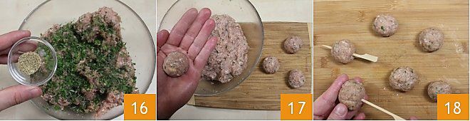 y las semillas de hinojo 16. Ahora forma las albóndigas: intenta obtener albóndigas más o menos del mismo tamaño 17 (del peso de unos 20 g cada una) para que tengan una cocción homogénea. Pincha las albóndigas con palillos 18, calienta el agua de la olla y espera a que hierva.
