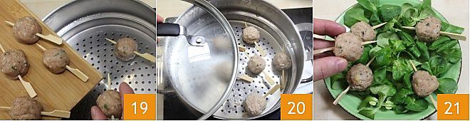 Coloca las albóndigas aromáticas en la vaporera 19 y cocínalas durante unos 18 minutos cubiertas con la tapa 20. (Si quieres, también puedes cocinarlas en el horno: coloca las albóndigas en una fuente engrasada y hornea en horno estático durante 30 minutos a 180° o en horno ventilado a 160° durante unos 25 minutos). Una vez cocidas, sirve las albóndigas aromáticas al vapor bien calientes, si lo deseas puedes acompañarlas con una fresca ensalada de canónigos 21.
