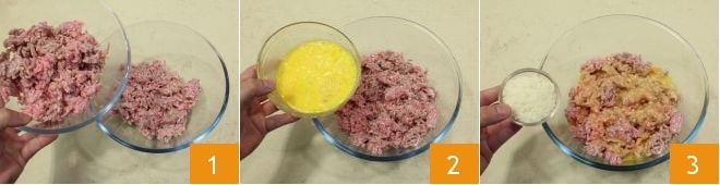 Para realizar las albóndigas de ternera al limón y mejorana colocad en un bol la carne picada de ternera 1, añadid los huevos batidos 2, el parmesano rallado 3