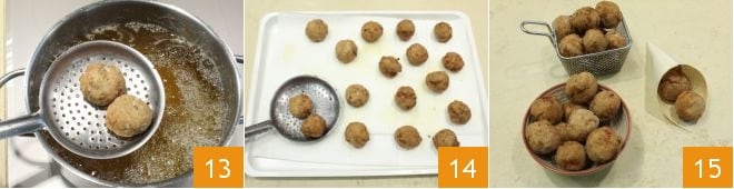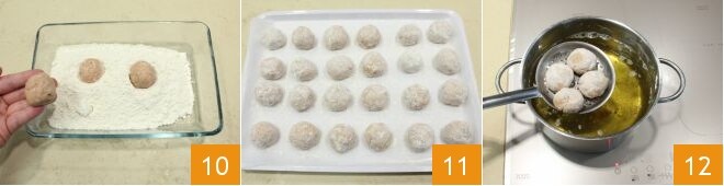 Finalmente, pasad cada albóndiga por harina (10-11). Cocinad las albóndigas: en una cacerola calentad abundante aceite de cacahuete, cuando el aceite haya alcanzado la temperatura ideal para la fritura (170-180°) sumergid las albóndigas en el aceite 12