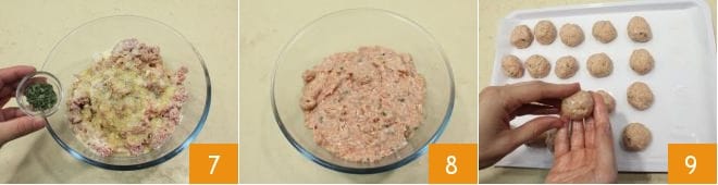 aromatizad la masa con la mejorana fresca picada 7 y mezclad con un tenedor todos los ingredientes. Cuando la masa esté homogénea 8, comenzad a formar las albóndigas: tomad una porción de masa del tamaño de una nuez y dadle forma redonda con las manos. Con estas cantidades obtendréis aproximadamente 24 albóndigas, a medida que las formáis, colocadlas en una bandeja forrada con papel de horno 9.