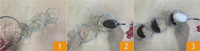 Para preparar el porridge vegano, lo primero que hay que hacer es obtener 3 vasitos o cuencos con capacidad de unos 450 ml. Vierte en cada uno 50 g de copos de avena 1, una cucharada de semillas de chía 2 y una cucharada de yogur de soja 3.