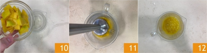 Ahora haz lo mismo con el mango: pélalo y córtalo en cubitos, luego transfiere la mitad a un recipiente alto y estrecho 11 y tritura hasta obtener un puré liso 12. Reserva los cubitos que servirán para la decoración.