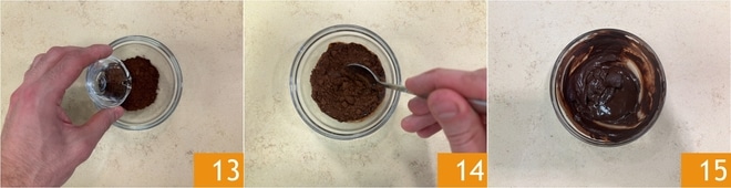 Pasa al topping de cacao: en un cuenco pequeño, vierte el cacao y el agua 13, añade el jarabe de arce y mezcla con una cucharilla 14 hasta obtener una salsa lisa 15.