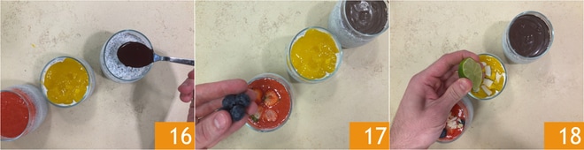 Completa cada vasito con un topping diferente 16. Decora el de fresa con trozos de fresas, arándanos y láminas de almendra 17. En cuanto al de mango, decora con coco deshidratado en cubitos, trozos de mango y unas gotas de lima 18.