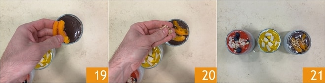 Finalmente, lava el albaricoque y córtalo en rodajas, luego colócalo en el porridge de cacao 19 y decora con el granillo de avellanas 20. ¡Tu porridge vegano está listo, solo te queda elegir tu sabor favorito 21!