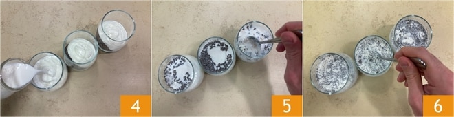 Añade 120 g de leche de soja 4 y mezcla bien con una cucharilla 5, hasta obtener una mezcla uniforme 6. Cubre los vasitos con film transparente y coloca en el frigorífico durante al menos 5 horas.