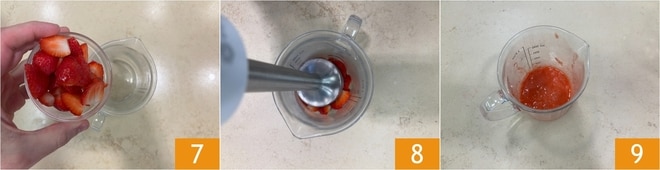 Transcurrido el tiempo de reposo, podéis preparar los toppings. Vierte aproximadamente la mitad de las fresas, sin el pedúnculo y cortadas en trozos, en un recipiente alto y estrecho 7, luego tritura con una batidora de mano 8 hasta obtener una crema lisa 9.