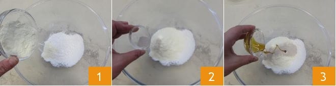 Para preparar la puccia salentina con aceitunas, comenzad con la preparación del fermento. Tomad un bol grande y verted en él la harina 00 y la de sémola de trigo duro 1. Añadid la levadura 2 y la malta 3.