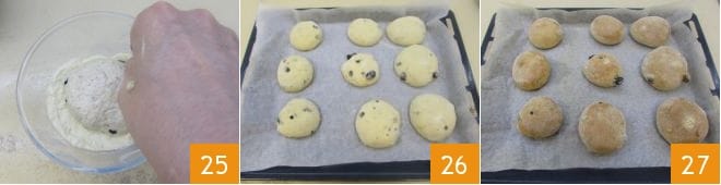 Pasadlas por la harina de sémola de trigo duro hasta cubrir completamente la superficie de la pieza de masa 25. Tomad una bandeja de horno, cubridla con papel de horno y disponed las esferas de masa sobre ella. Aseguraos de disponer las puccias distanciadas unas de otras 26. Dejad fermentar así durante aproximadamente 1 hora. Ahora hornead en horno estático precalentado a 230°C durante aproximadamente 40 minutos (si utilizáis un horno ventilado, coced a 210°C durante aproximadamente 30 minutos). Una vez cocidas, sacadlas del horno 27 y dejadlas enfriar sobre una rejilla hasta que alcancen temperatura ambiente. Aquí concluye la preparación de las puccias salentinas con aceitunas.