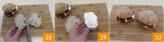 Si lo deseáis, podéis rellenar las puccias con mozzarella y tomates secos. Si queréis proceder con el relleno, cortad la puccia por la mitad con la ayuda de un cuchillo 28, disponed una o dos lonchas de mozzarella 29 y sobre ellas colocad algunos tomates secos. Luego cerrad con la otra mitad y obtendréis vuestras puccias salentinas con aceitunas rellenas 30!