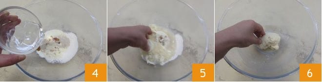 Después añadid el agua tibia poco a poco haciéndola absorber bien por la masa 4 amasando con las manos 5 hasta obtener una mezcla lisa y homogénea. Dadle ahora la forma de una pequeña esfera 6.