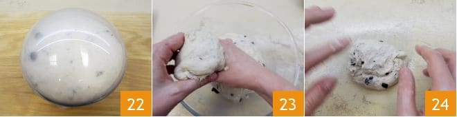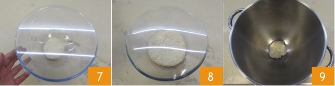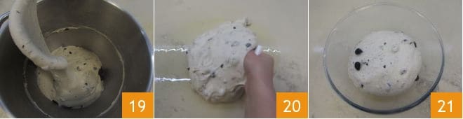 Poned en marcha la batidora y amasad a velocidad media hasta que la masa esté bien trabajada: tomará alrededor de 10-15 minutos 19. Transferid la masa a una superficie de trabajo ligeramente aceitada 20. Trabajad la masa para darle una forma esférica y transferidla a un bol grande ligeramente aceitado 21, cubierto con film transparente.