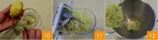 Ahora hervid las patatas en una cacerola con abundante agua. Tomará aproximadamente 30-40 minutos dependiendo del tamaño de las patatas que utilicéis. Una vez hervidas (podéis hacer la prueba con los dientes de un tenedor), peladlas 10 y trituradlas con un prensapuré dentro de un bol pequeño 11. Transferidlas al bol de la batidora 12.