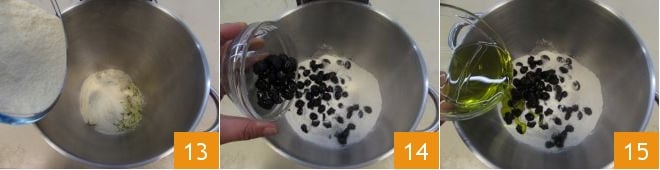 Añadid la harina 00 y la sémola tamizadas 13 y finalmente también las aceitunas sin deshuesar 14. Agregad el aceite 15.