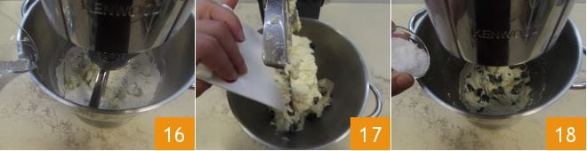 Amasad a velocidad baja con la pala. Añadid el agua tibia en hilo 16 haciéndola absorber gradualmente por la mezcla. Cuando los ingredientes estén completamente integrados, separad la mezcla de la pala ayudándoos con una rasqueta 17. Luego, reemplazad la pala con el gancho y añadid la sal 18.