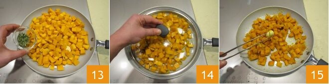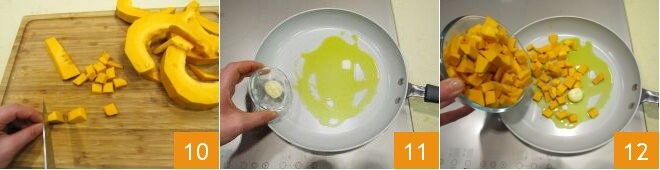 Reducidla a rodajas, luego a cubos de igual tamaño para permitir una cocción uniforme 10. Luego tomad una sartén antiadherente y de fondo amplio y dejad dorar un diente de ajo con 20 g de aceite 11. Cuando tenga un color dorado, añadid la calabaza 12.
