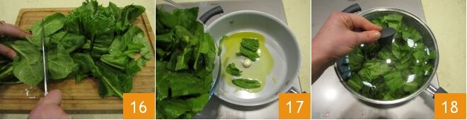 Mientras la calabaza se ablanda, pasad a la preparación de la acelga. Enjuagadla y cortadla a la mitad si las hojas son demasiado largas para poder cocinarse bien en la sartén 15. Dorad un diente de ajo con 20 g de aceite y cuando esté dorado, añadid las acelgas 17. Cubrid con la tapa y dejad marchitar a fuego muy lento durante unos 5-6 minutos 18. Luego quitad el ajo, salpimentad.