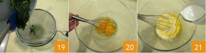 Escurrid las acelgas del exceso de agua para evitar que al añadir al relleno, resulte demasiado líquido 19. Reservad la preparación de las acelgas y la calabaza ya ablandada. Proceded creando la mezcla de acompañamiento. En un bol grande batid los huevos con un batidor de mano 20, ajustando de sal y pimienta. Verted la nata en un hilo mientras seguís batiendo 21.