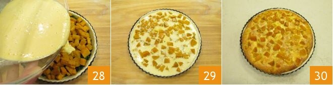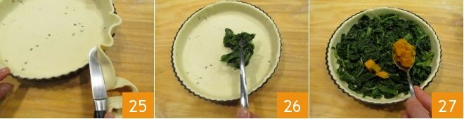 Haced que la pasta brisé se adhiera bien al fondo y a los bordes del molde, luego cortad el exceso de pasta recortando con la hoja de un cuchillo los bordes 25. Disponed de manera uniforme las acelgas cocidas y bien escurridas en el fondo 26, luego cread también una capa de cubos de calabaza 27.