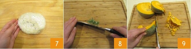 Transferidla a una superficie de trabajo, dadle forma esférica 7, aplanadla ligeramente y cubridla con film transparente: llevad la masa a reposar en el frigorífico por al menos 40 minutos. Mientras la masa reposa, proceded con la preparación del relleno: picad finamente una ramita de romero previamente lavada y secada 8, luego eliminad la piel de la calabaza 9.