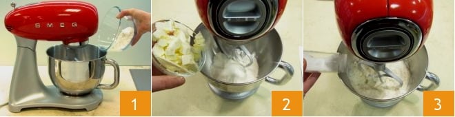Para preparar la quiche de calabaza y acelga comenzad con la preparación de la Pasta brisa. En una batidora equipada con pala, verted la harina 1, la mantequilla fría de la nevera en trozos 2 y una pizca de sal 3.