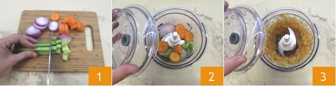 Para preparar el ragú de seitán, comenzad ocupándoos del sofrito de verduras, que se prepara de forma clásica. Limpiad la cebolla, la zanahoria y el apio y cortadlos en trozos grandes 1. Colocad todo en la batidora 2 y accionad las cuchillas hasta obtener un picado muy fino 3.