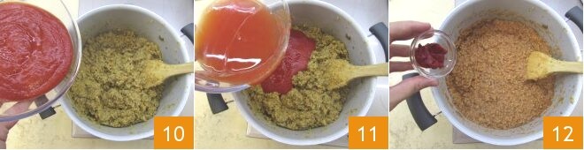 incorporad la salsa de tomate 10, enjuagando el recipiente con un poco de agua para recoger toda la salsa y hacer el ragú un poco más húmedo 11. Mezclad bien y añadid también el concentrado de tomate 12.