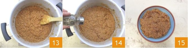 Continuad la cocción, a fuego lento, durante 40 minutos, removiendo a menudo para que el ragú no se pegue 13. Hacia el final de la cocción, añadid sal y pimienta 14 y mezclad con cuidado. ¡El ragú de seitán está listo para ser utilizado en vuestras creativas recetas!