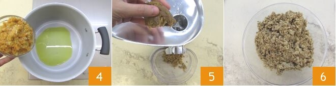 Calentad el aceite en una cacerola grande y añadid el picado de verduras 4. Dejad dorar a fuego lento durante al menos 15 minutos, hasta que el sofrito esté seco. Mientras tanto, dedicad vuestra atención al seitán. Introducidlo poco a poco en una picadora 5 para obtener un picado 6. Si no disponéis de una picadora, podéis picar el seitán con un cuchillo.