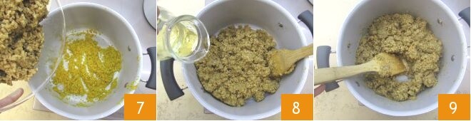 Añadid el seitán picado al sofrito 7 y dejad dorar unos minutos, removiendo a menudo con una cuchara de madera. Luego, verted el vino blanco 8 y dejadlo evaporar. Apenas el ragú vuelva a estar seco 9