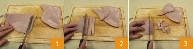 Para preparar las reginette con crema de ricotta y daditos de pez espada, primero poned a calentar en el fuego una cacerola con abundante agua, salada al gusto, que servirá para la cocción de la pasta. Mientras tanto, dedicad vuestra atención a la preparación del pez espada. Quitad la piel del pescado 1 y cortadlo primero en tiras 2 y luego en daditos 3.