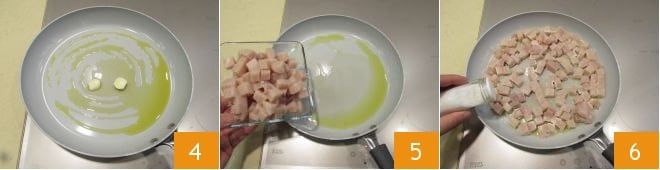 Poned a sofreír un diente de ajo en una sartén con un poco de aceite de oliva virgen extra 4, luego eliminadlo y agregad los daditos de pez espada 5. Añadid sal 6,