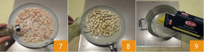añadid pimienta 8, rociad con vino blanco 8 y dejad cocinar durante un máximo de 5 minutos. Luego coced vuestras reginette 9