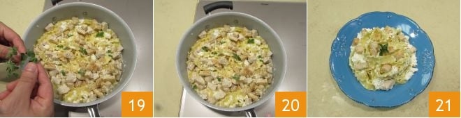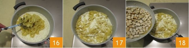 Cuando la pasta esté lista, escurridla y vertedla en la cacerola con la crema de ricotta 16, mezclad bien todo y luego unid los daditos de pez espada 18.