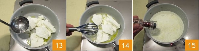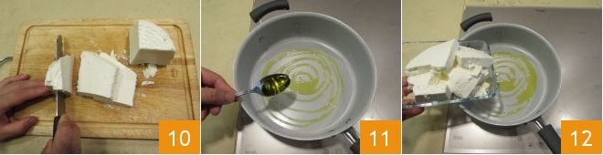 y mientras tanto cortad groseramente la ricotta 10, añadid un poco de aceite en una cacerola amplia 11 y verted la ricotta 12.