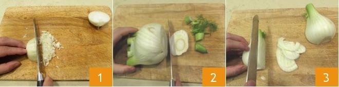 Para preparar el risotto con hinojo, prepara primero el Caldo de verduras y mantenlo caliente. Procede luego limpiando la cebolla y picándola finamente 1. Limpia los hinojos eliminando la base, los tallos 2 y las hojas externas si están dañadas: deberás obtener en cualquier caso 320 g de hinojo que necesitarás para la receta. Lávalos, córtalos por la mitad y córtalos finamente 3.